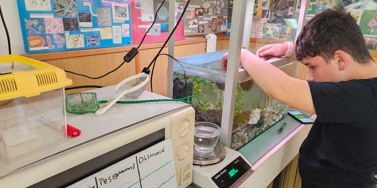 El Martí parteix d’uns alevins de pocs dies de vida situats a un aquari del laboratori de secundària i estudia el seu creixement, tenint en compte l’alimentació subministrada, la temperatura de l’aigua i les hores de llum. Per fer-lo, anota periòdicament les dades obtingudes, entre les quals destaca especialment el pes dels exemplars, que obté ficant-los en un recipient amb aigua situat en una balança d’alta precisió.